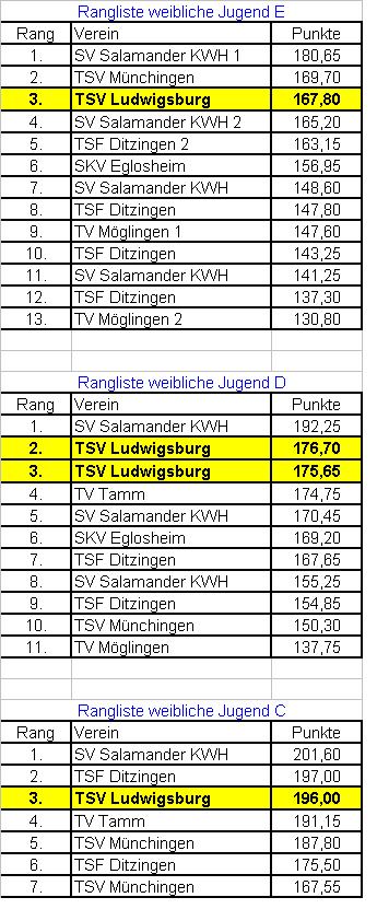 Platzierung Verein Punkte 1. SpVgg Holzgerlingen 128,15 2. TSV Ludwigsburg 127,60 3. TV Feldrennach 119,80 4. TSV Heumaden 107,05
